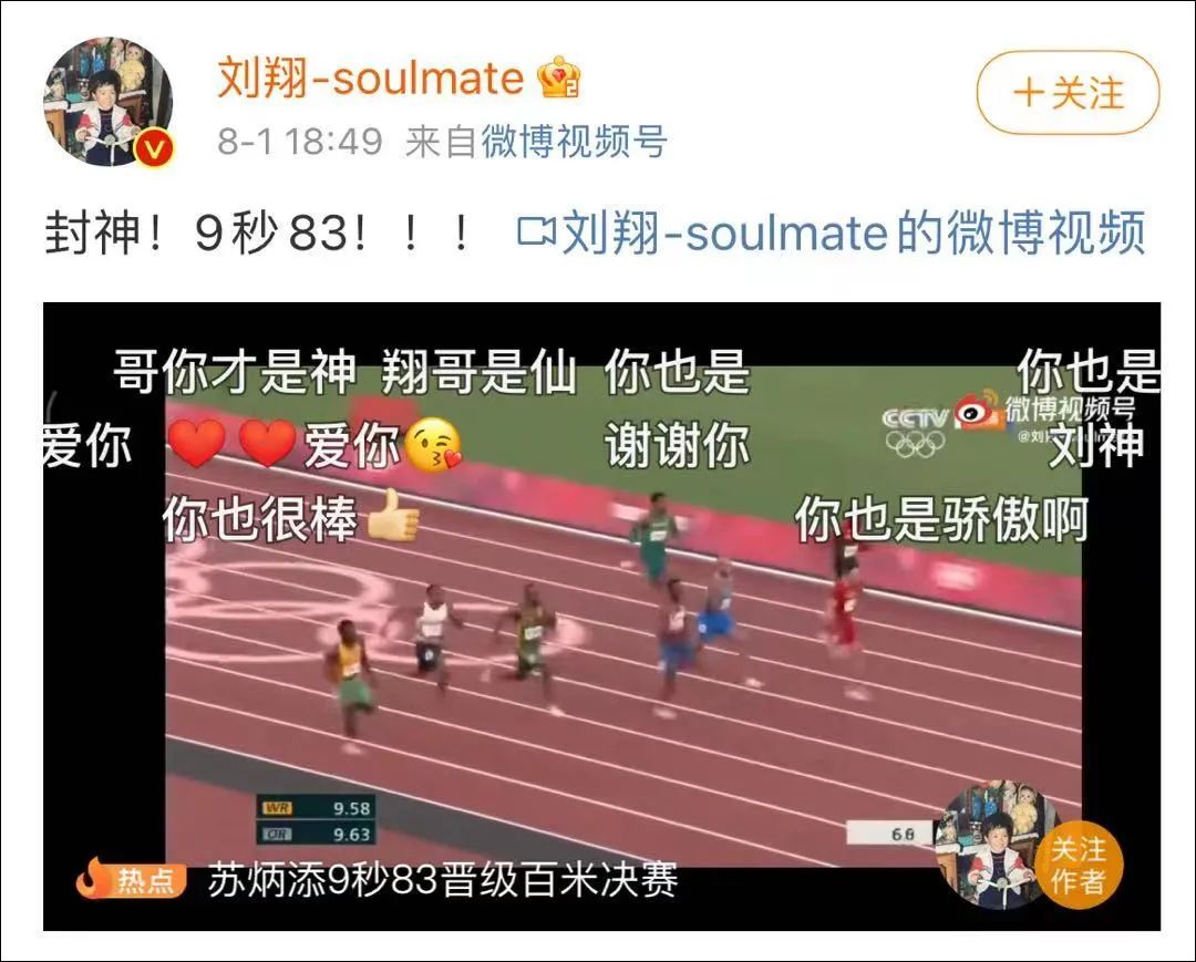 昨天,刘翔也第一时间给苏炳添送上祝福,“9秒83,封神!”