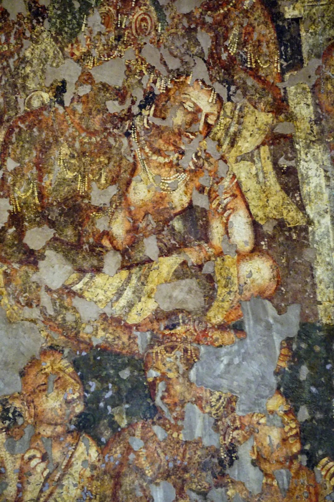 即便斑驳严重,我们也能看出:画中菩萨半裸上身,肌肤以红棕色从轮廓线边缘向内晕染,逐渐淡化为明亮的浅棕色和肉色。