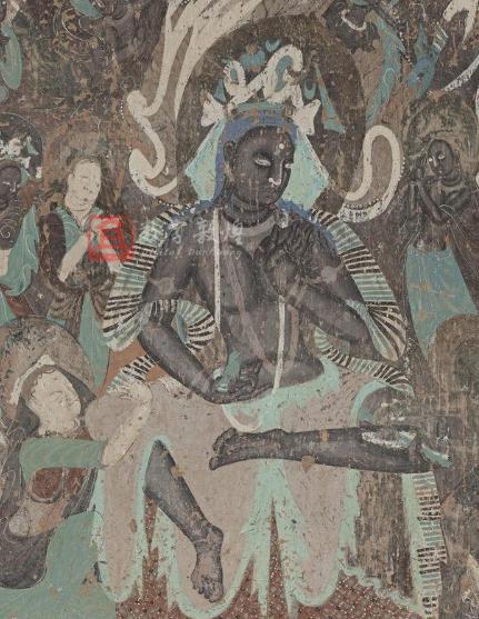 莫高窟第254窟壁画只可惜,由于颜料的氧化,我们今天看到的菩萨由黑色和灰褐色组成,不如阿旃陀壁画那样富有肉感。