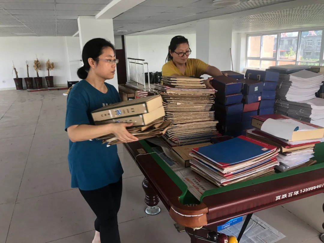 卫辉市气象局职工将一楼重要档案资料和物品搬运至二楼