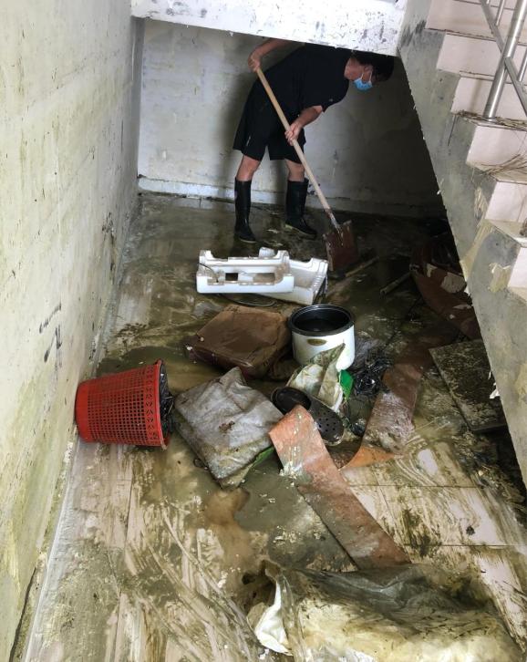 卫辉市气象局职工正在清理一楼淤泥