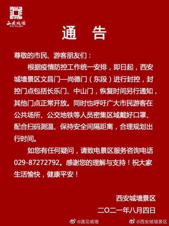 西安城墙景区文昌门—尚德门(东段)8月4日起实施封控今天(8月4日),西安城墙景区发布通告,对西安城墙景区文昌门—尚德门(东段)进行封控。通告详情如下:尊敬的市民、游客朋友们:根据疫情防控工作统一安排,即日起,西安城墙景区文昌门—尚德门(东段)进行封控,封控门点包括长乐门、中山门,恢复时间另行通知,其他门点正常开放。