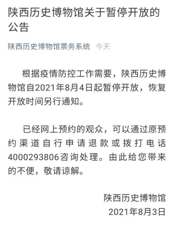 自8月4日起,陕西历史博物馆暂停开放,恢复时间另行通知。