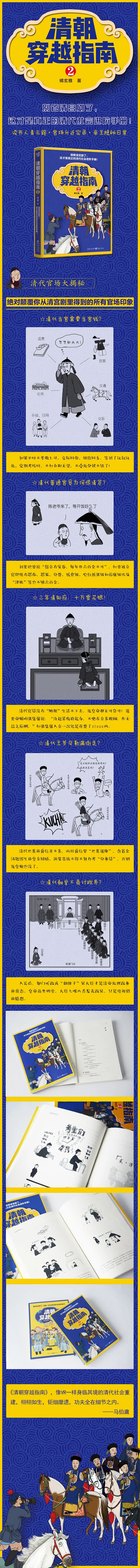 在《清朝穿越指南2》中,历史科普作家橘玄雅沿用上部的风格,继续用VR一样的描述带我们领略清代男子的社会进阶之路。在书中,橘玄雅不仅详细介绍了清代普通白丁的科举进阶之路,也记录了很多文武官员晋升的细节,并讲述了即使是含着金汤匙出生的皇亲国戚、满蒙贵族也要努力考“公务员”、挣口皇粮,而皇帝的生活也不像电视剧里那样清闲,书中大量的对比性细节,绝对颠覆你从清宫剧里得到的所有官场印象!这是一部追剧狂人必备的正经历史科普书!
