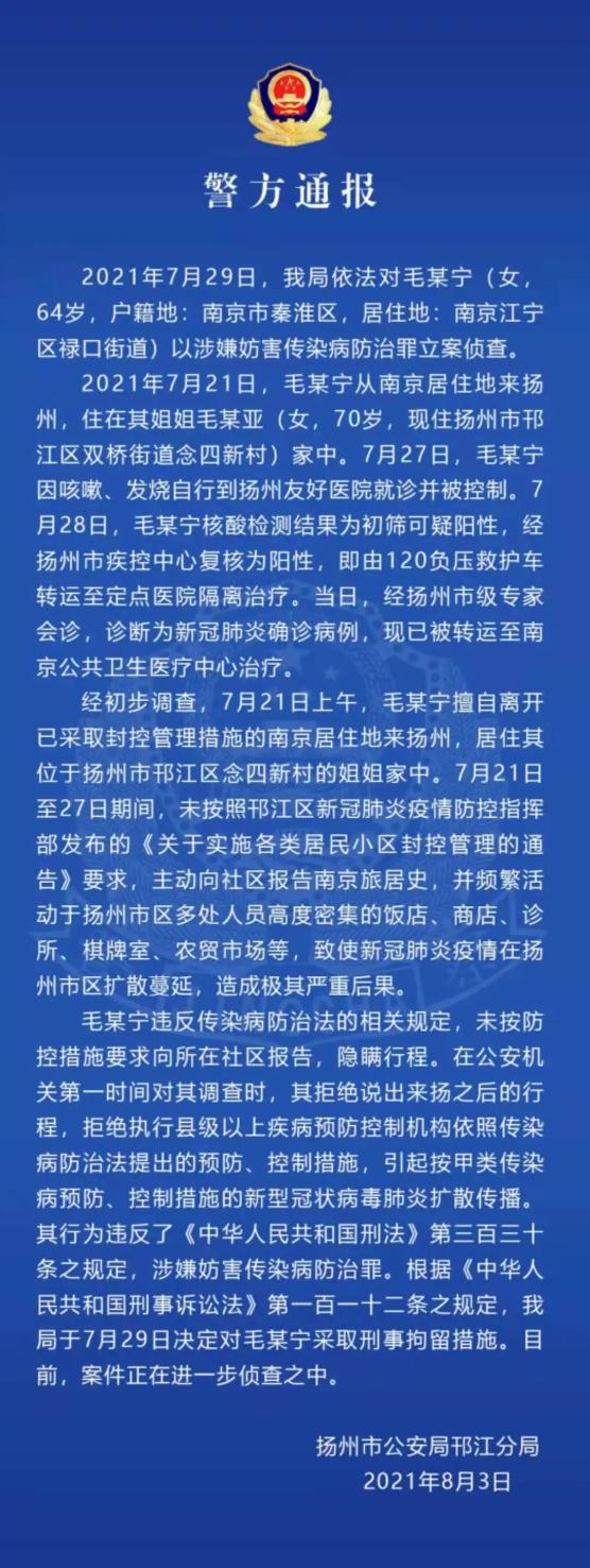 2021年7月29日,扬州市公安部门对毛某宁(女,64岁)以涉嫌妨害传染病防治罪立案侦查。因系新冠肺炎确诊病例,根据统一安排,毛某宁被转运至南京定点医院治疗。目前,案件正在进一步侦查之中。提醒大家:心存侥幸,造成病毒扩散,必将受到法律严惩。