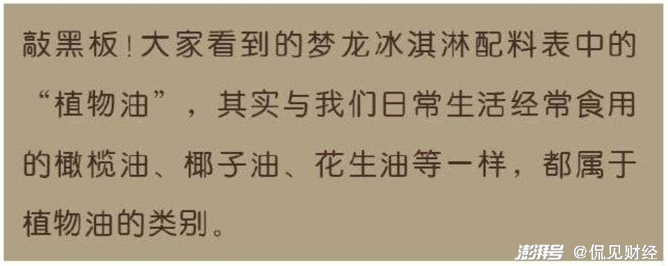 因此,梦龙在其回应中强调,植脂并不是植脂末,而是植物油脂,和日常生活中经常食用的橄榄油、椰子油、花生油一样。