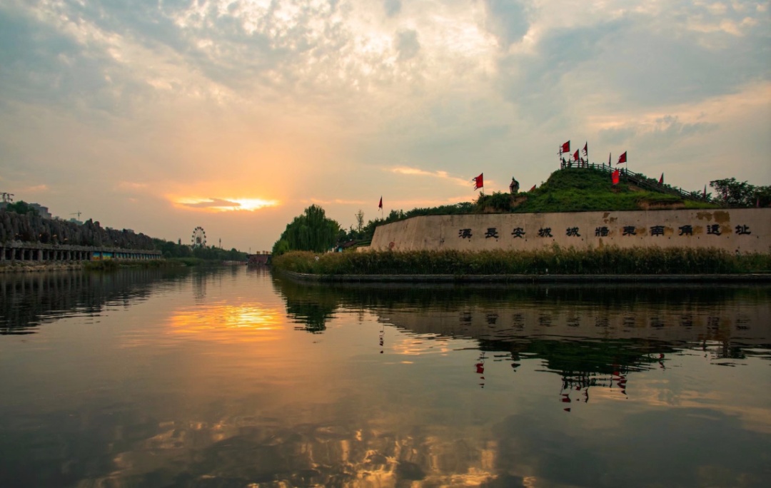 绕过大风阁向北,就来到了回澜桥。桥是拱形的,两侧分别有两个小桥洞。其形曲折,曲径通幽。再向西北方向前行就可以登上汉长安城城墙遗址——极目远眺,几面写着大“汉”字样的红色旗子高高飘扬,像守城护卫兵一般笔直威武,日夜守护着美丽的“家园”。