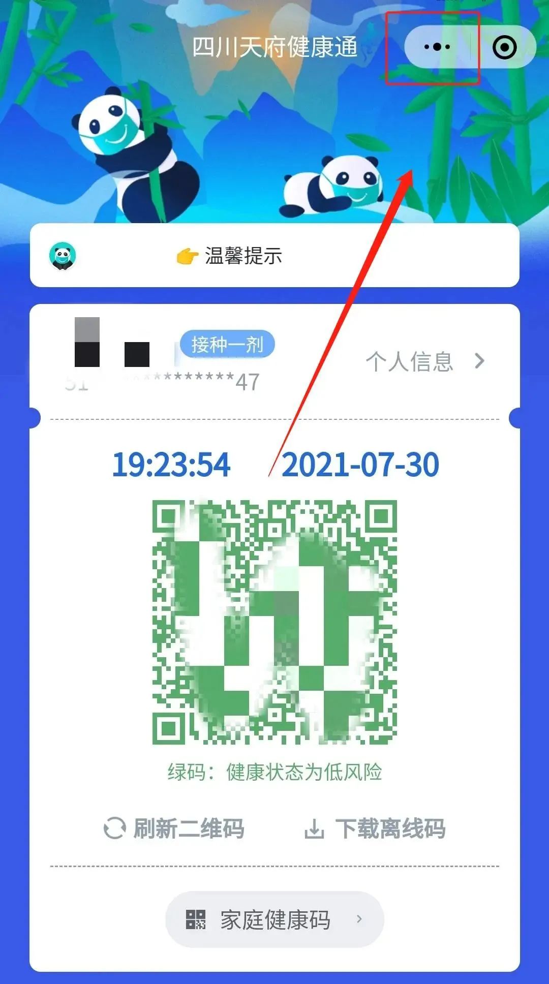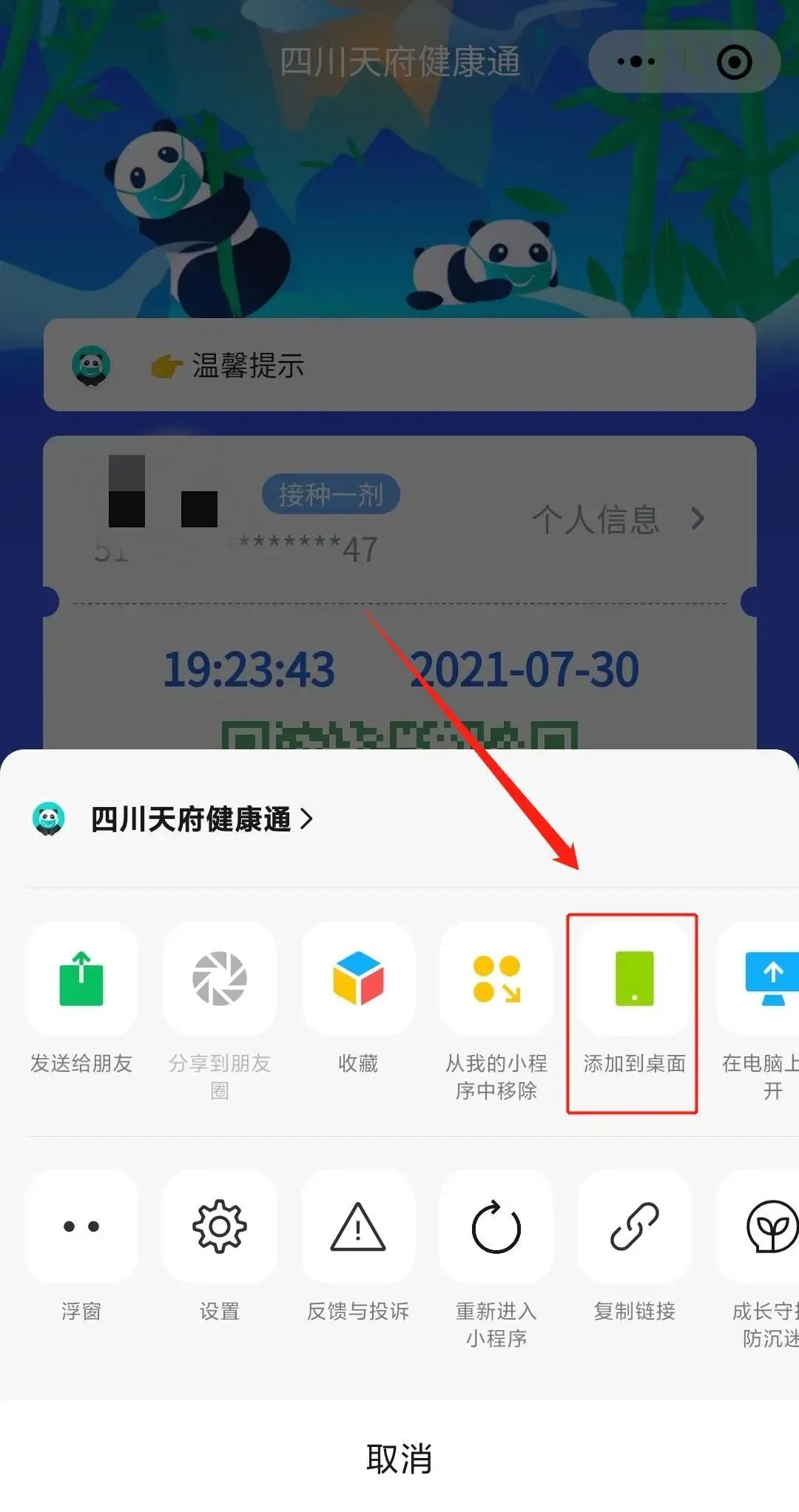 打开“四川天府健康通”小程序,点击右上角的“…”,点击“添加到桌面”