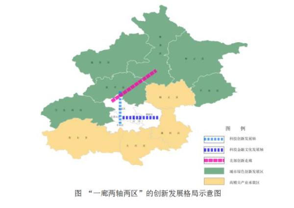“一廊”是指以中关村科学城、怀柔科学城、未来科学城为核心的京北创新走廊;“两轴”是指一纵轴一横轴,其中一纵轴是以海淀区、石景山区、丰台区为核心的科技创新发展轴,一横轴是指东起CBD—定福庄国家文创试验区西至北京金融街的以长安街及其延长线为核心的科技文化金融发展轴。“两区”是分指北京市高精尖产业承载区和城市绿色创新发展区。其中,城市高精尖产业承载区主要是以顺义区、通州区、大兴区、北京经济技术开发区、丰台科技园、房山区、门头沟区的平原地区为发展重点。城市绿色创新发展区主要包括了门头沟区、平谷区、怀柔区、密云区、延庆区、房山区和昌平区的山区部分以及城市二道“绿隔”发展所涉及的重点区域。