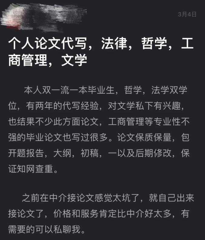 在微博话题#毕业论文#、#学术写作#下、豆瓣“毕业论文交流”小组平台上,如今还能找到不少隐蔽的论文代写商家,为了躲避平台方的“封杀”,他们以代修改、代降重、选题指导、论文润色等名目接单“代写”业务。