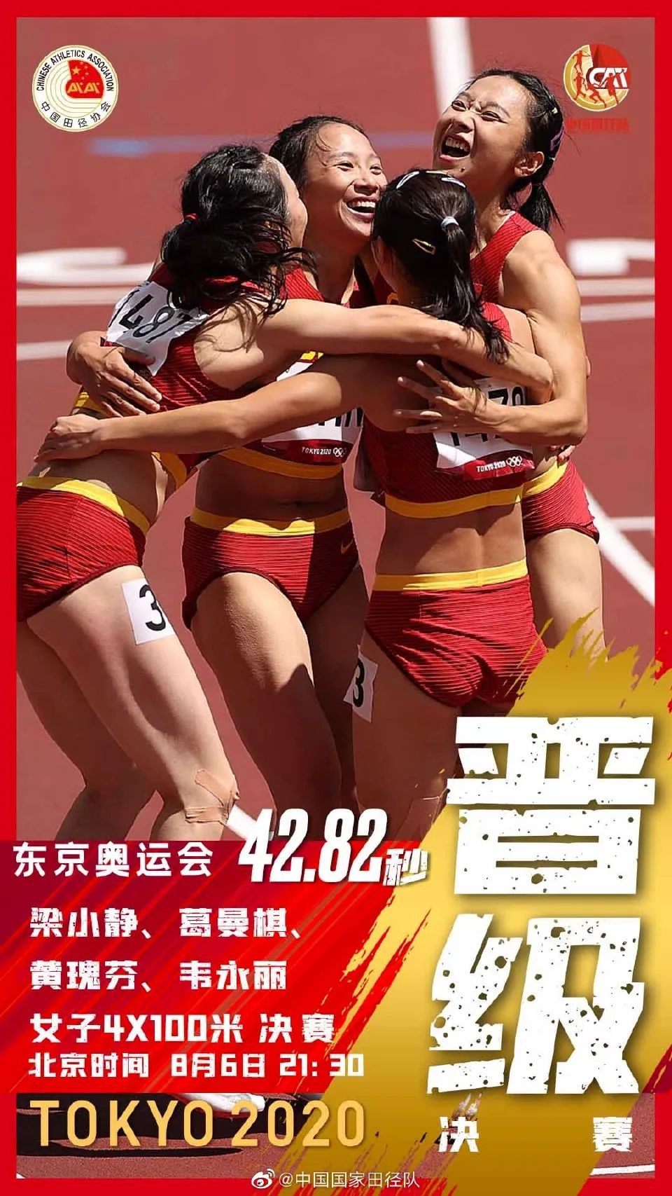 北京时间8月5日,东京奥运会田径女子4×100米接力比赛预赛,梁小静 、葛曼棋 、黄瑰芬、韦永丽代表中国队出战,跑出42秒82,排名小组第三,晋级决赛!