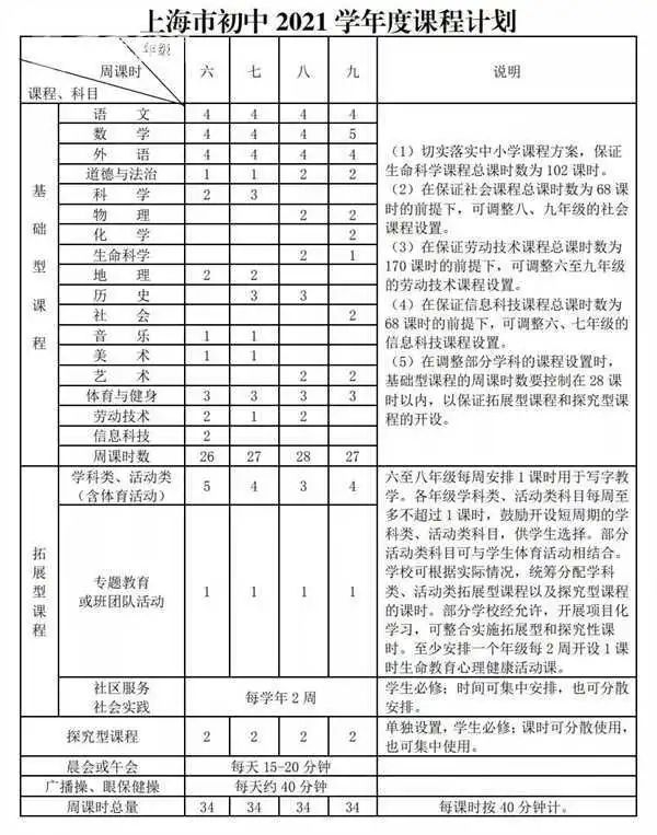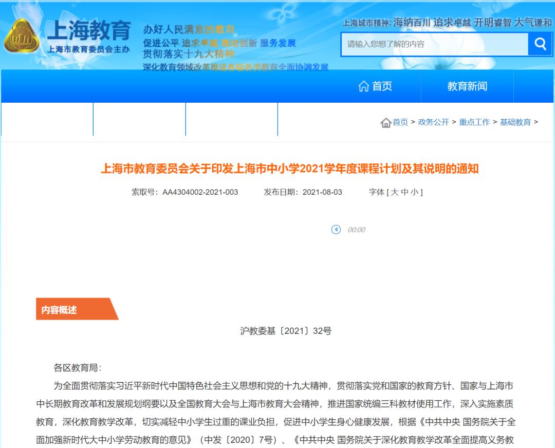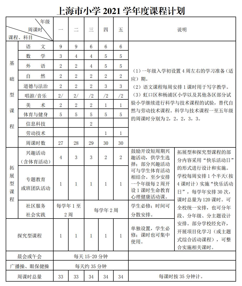 近日,上海市教委印发《上海市中小学2021学年度课程计划及其说明》的通知,要求各区教育行政部门及中小学要严格按照中央和本市有关深化教育教学改革、深入实施素质教育、进一步规范课程教学工作、减轻学生过重课业负担的要求,加强教育管理,认真执行课程计划,努力提高教育质量。
