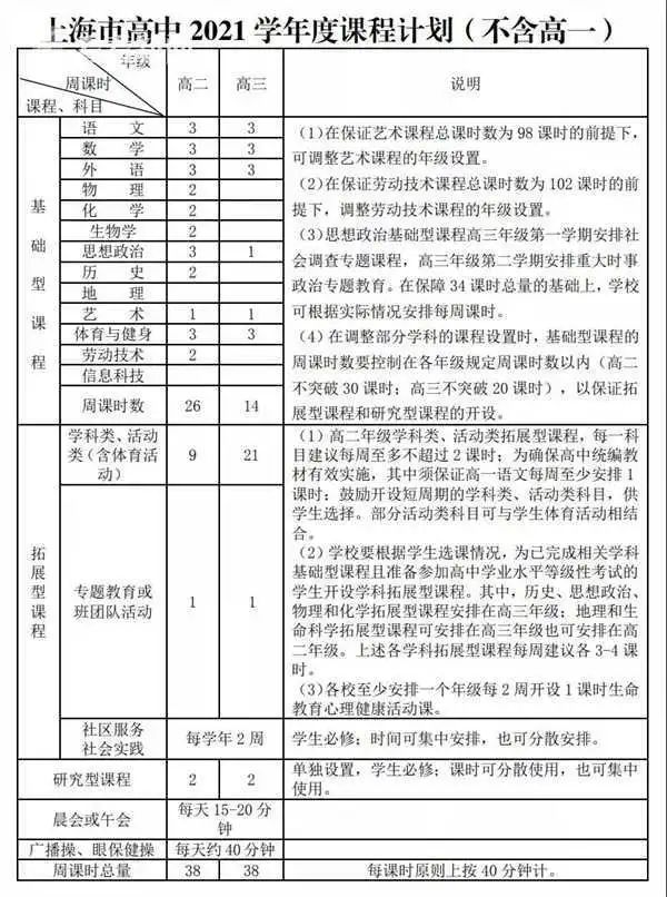 高中各年级全学年教学活动的总时间为40周。其中,社会实践活动时间为2周。高二年级授课时间按34周计,复习考试、节假日及重大活动时间为4周;高三年级授课时间按30周计,复习考试、节假日及重大活动时间为8周。五、高中各年级每课时原则上按40分钟计,每周课时总量为38节。学校要合理安排高中各年级的基础型课程、拓展型课程和研究型课程的课时,原则上不能将拓展型课程和研究型课程的课时移作补课用。从2021学年高一年级开始,本市普通高中将施行新课程新教材,具体要求按照另行发布的《上海市普通高中课程实施方案》执行。来源:新闻晨报