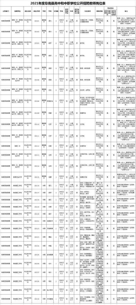 徽省事业单位公开招聘人员暂行办法〉的通知》(皖人社发〔2010〕78号)、中共安徽省委组织部 安徽省人力资源社会保障厅《关于贯彻落实应对新冠肺炎疫情影响做好事业单位公开招聘高校毕业生工作有关事项的通知》(皖人社秘〔2020〕73号)和《关于印发〈阜南县人才引进“二十条”奖励办法(试行)〉的通知》(南发〔2018〕2号)规定和要求,现就2021年度阜南县高中和中职学校公开招聘教师有关事项公告如下: