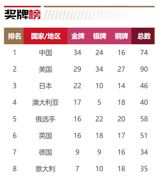 中国体育代表团在东京奥运会已获得34金24银16铜