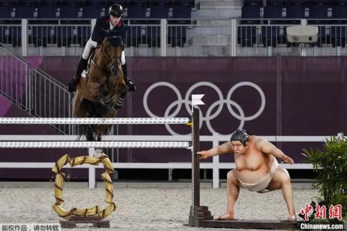 在日前的东京奥运会马术个人场地障碍预赛中,赛场上的相扑手雕塑与真人大小相当,弓着腰,似乎准备好了攻击。多匹赛马在接近这一障碍物附近时停了下来,导致选手被扣分,无法晋级决赛。