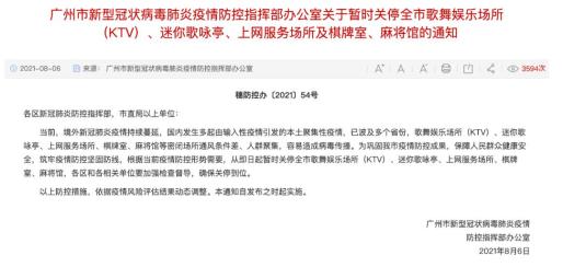 广东省广州市新型冠状病毒肺炎疫情防控指挥部办公室今日(6日)发布通知,根据当前疫情防控形势需要,从即日起暂时关停全市歌舞娱乐场所(KTV)、迷你歌咏亭、上网服务场所、棋牌室、麻将馆,防控措施依据疫情风险评估结果动态调整。