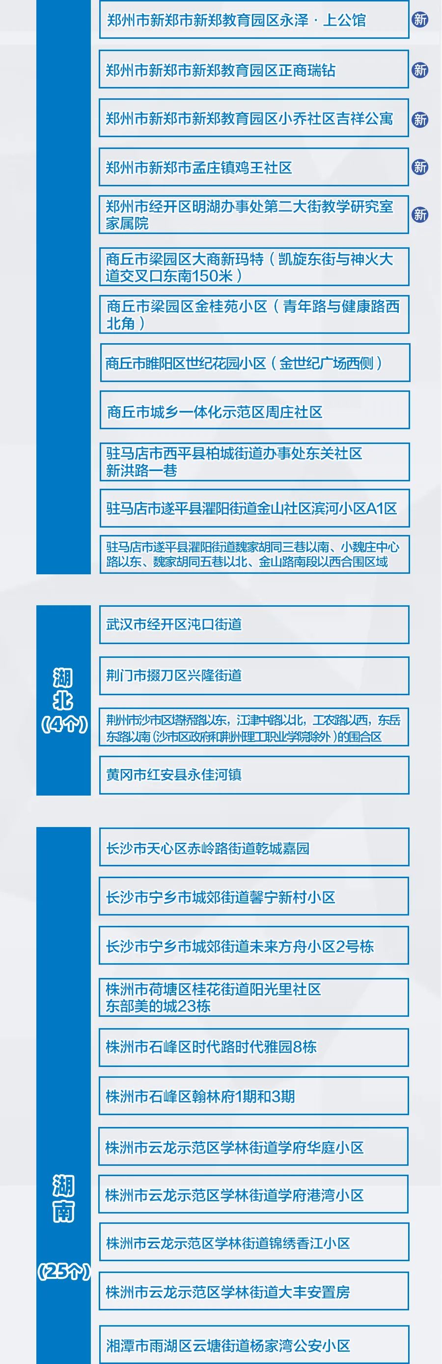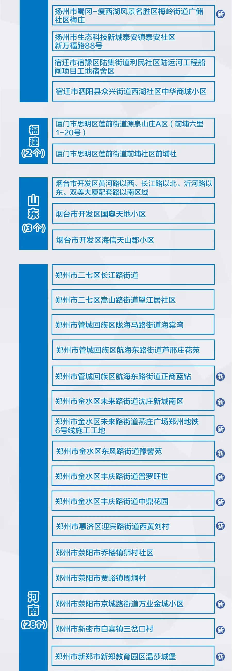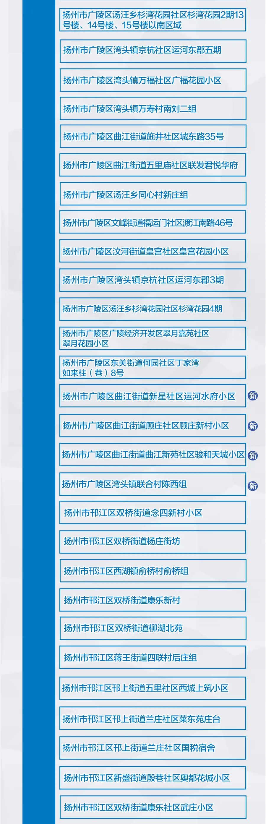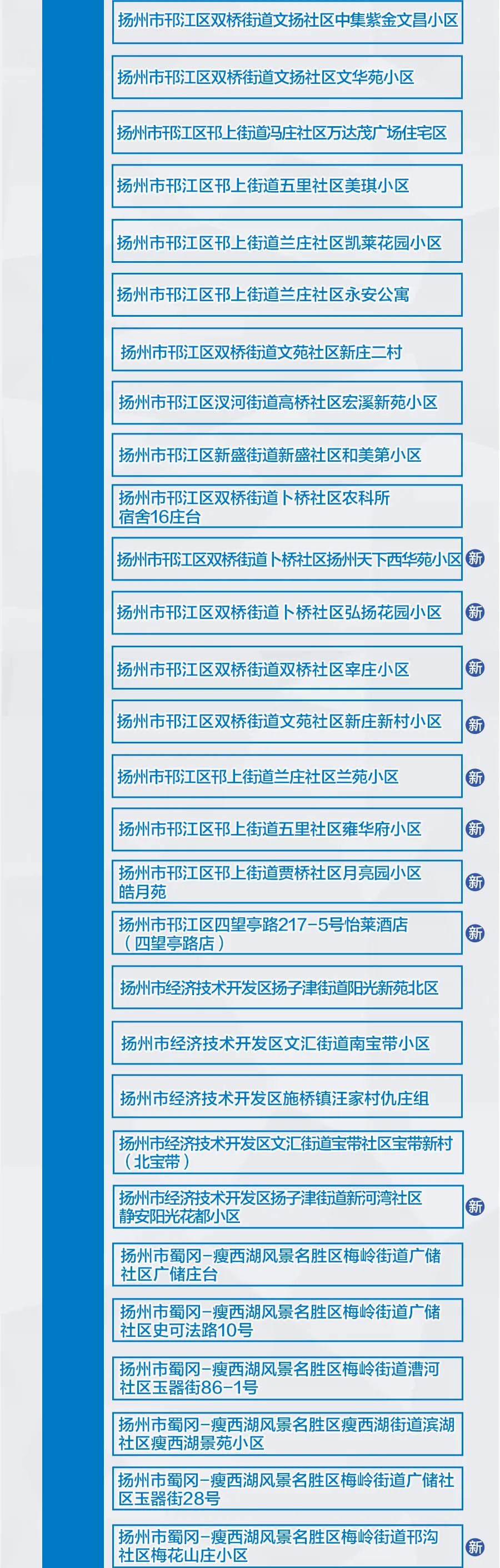 扬州市新冠肺炎疫情防控工作指挥部发布通告,根据国务院联防联控机制《关于调整新冠肺炎疫情分区分级标准实施精准管控措施的通知》(国电发〔2020〕11号)要求,经扬州市新冠肺炎疫情防控工作指挥部研究,自发布之日起,扬州市下列地区调整为中风险地区: