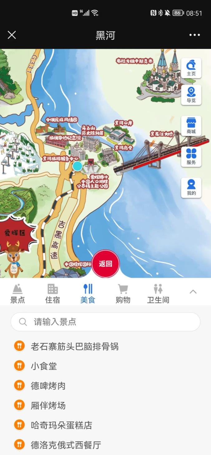 这是一张电子地图打开微信公众号“一部手机游黑河”,首先出现以你所在位置为中心的黑河旅游手绘地图,这张地图以我们常用的电子地图为基础,优化突出了游客需要的各种元素,让你想要找的位置更清晰,不需要的提示都屏蔽。旅行,在黑河变得简单而精准。