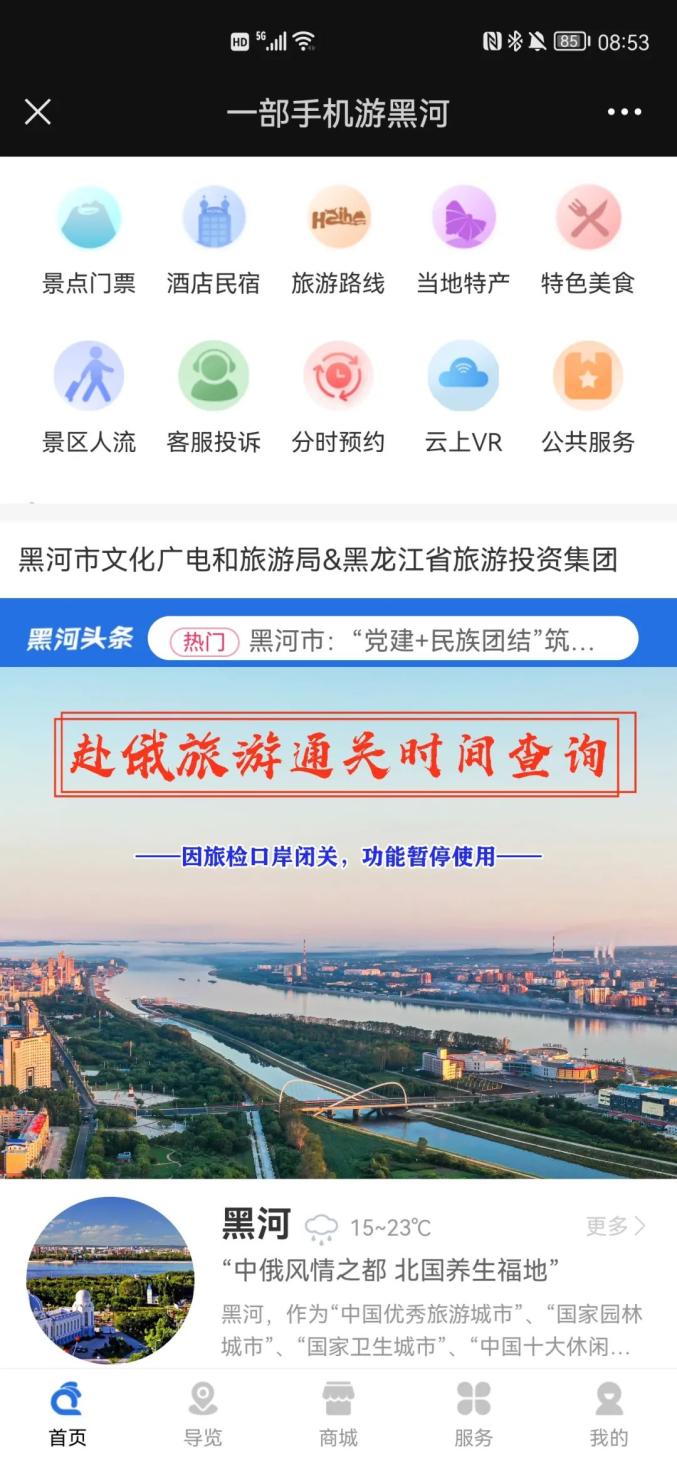 这是赴俄通关神器打开微信公众号“一部手机游黑河”,最牛的功能是查询赴俄旅游通关时间,到黑河旅游的朋友们,很多人的目标都是一江之隔的俄罗斯,由于两国口岸规章不同,以往通关都需要较长时间排队等候,现在使用“一部手机游黑河”,通关时间尽在掌握之中,用别人排队等候的时间放心大胆游玩景点,就是这个公众号对您最大的体贴。