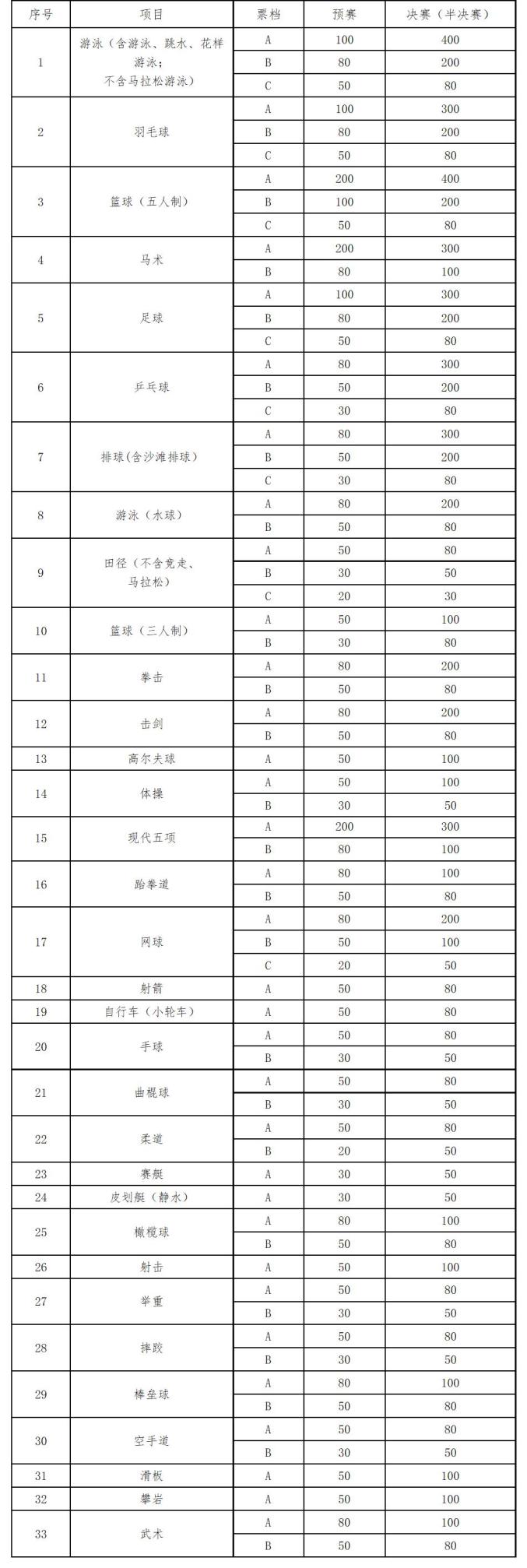 根据十四运会体育比赛门票价格表显示,十四运会田径项目预赛门票分为A、B、C三档,分别为20元、30元、50元,决赛票价为30元、50元、80元;五人制篮球预赛门票分别为50元、100元、200元,决赛为80元、200元、400元;乒乓球预赛门票分别为30元、50元、80元,决赛为80元、200元、300元。整体来讲,各单项体育比赛票价从20元至400元不等,可以说是比较亲民。