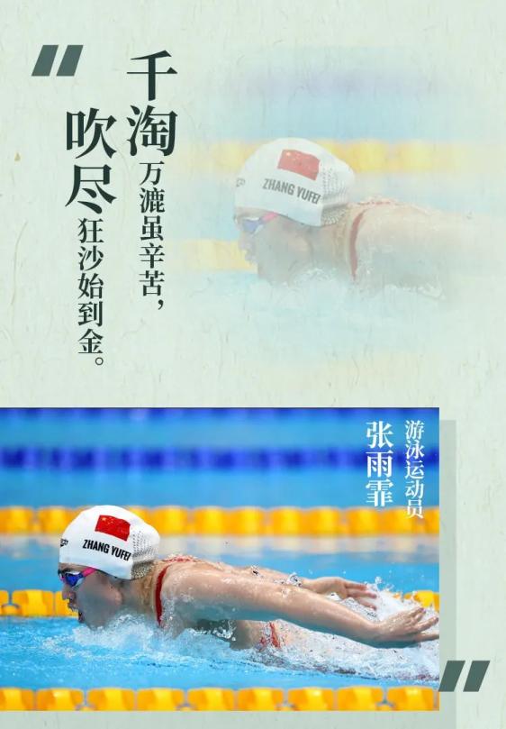张雨霏加冕“蝶后”,总台解说员引用了一句刘禹锡的《浪淘沙》,“千淘万漉虽辛苦,吹尽狂沙始到金”,意思是淘金要千遍万遍地过滤,虽然辛苦,但只有淘尽了泥沙,才会露出闪亮的黄金。这形容的是张雨霏经历过长时间的低谷期没有放弃,终于破茧化蝶。03