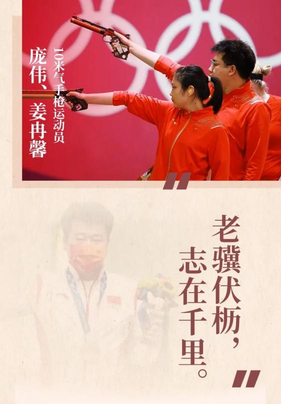 庞伟、姜冉馨在气手枪混合团体项目中惊天逆转,勇夺中国第七金。总台解说员引用了曹操《龟虽寿》里的名句“老骥伏枥,志在千里”来形容35岁的老将庞伟“青山不老”。不过,调皮的解说员最后还找补了一句:“当然,庞伟还不算老,还没到一枝花儿的年龄。”05