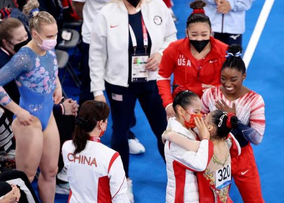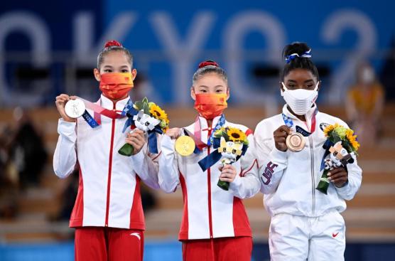 8月3日,女子平衡木冠军中国选手管晨辰(中)、亚军中国选手唐茜靖(左)与季军美国选手拜尔斯在颁奖仪式上。新华社记者 程敏 摄2