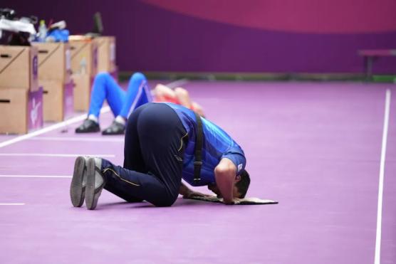 7月24日,冠军伊朗选手福鲁吉在夺冠后庆祝。新华社记者 鞠焕宗 摄看到他跪下亲吻赛场的那一刻