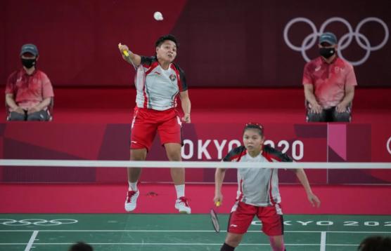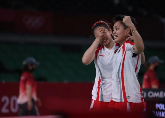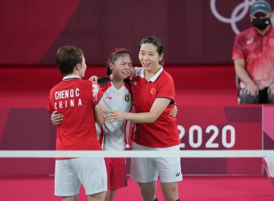 8月2日,陈清晨(左)/贾一凡(右)与波莉在比赛后。新华社记者 薛玉斌 摄在奥运赛场上