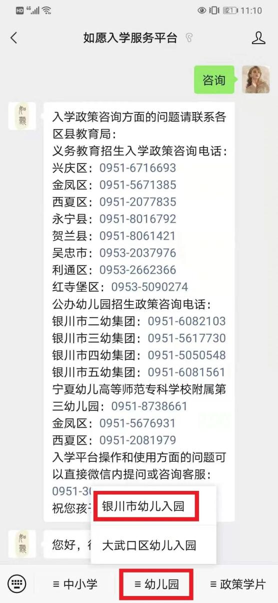 打开手机微信关注“如愿入学服务平台“公众号,在下方菜单点击“幼儿园”,选择“银川市幼儿入园”。