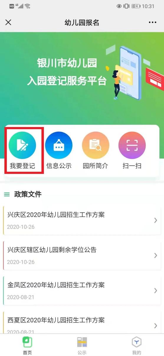 进入到银川市幼儿园入园登记服务平台,点击“我要登记”。