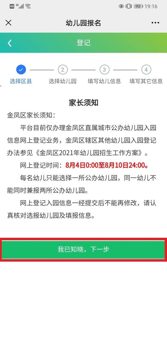 请仔细阅读《家长须知》,然后点击“我已知晓,下一步”。