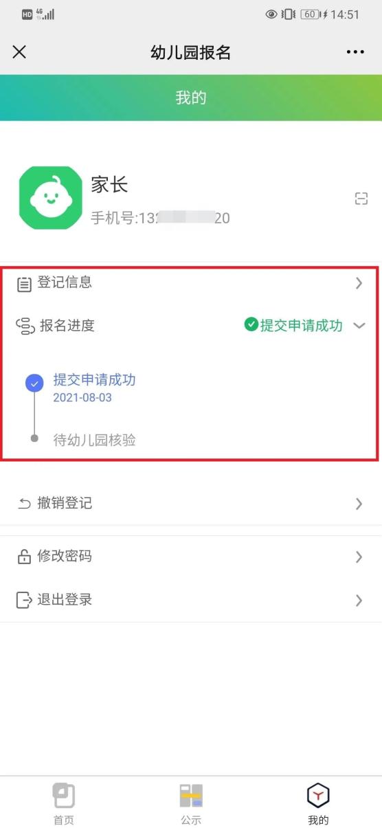提交报名信息成功后,可点击“我的”查看“登记信息”与“报名进度”。