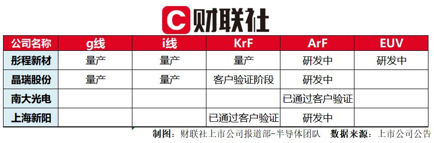 在半导体光刻胶领域,国内赛道上的主要玩家有彤程新材(603650.SH)、晶瑞股份(300655.SZ)、南大光电和上海新阳(300236.SZ)等。
