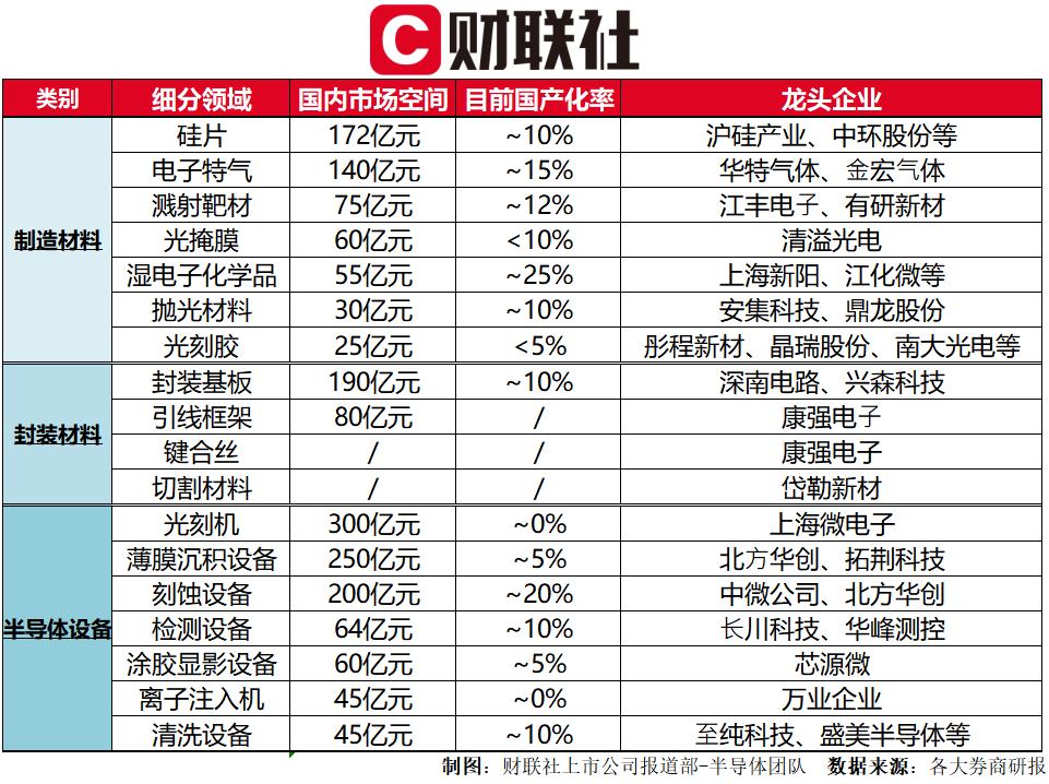以市场空间、自给率和技术难度为参照,财联社记者对半导体上游材料和设备上市公司进行梳理后发现,在一些细分领域,当下国内市场空间巨大,技术领先的头部企业有望在政策和资本扶持下迎来突破,同时受益于国内晶圆厂的产能扩充。此前,中微公司、长川科技(300604.SZ)、拓荆科技、北方华创(002371.SZ)和盛美半导体(ACMR.O)等已获大基金支持。