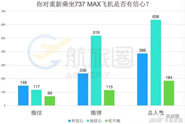 除了与监管机构保持审定的合作外,尽快恢复客户等多方的信心,复飞737MAX是波音的工作重点。停飞两年内,波音在中国、欧洲、澳洲等多国举行了多次会议,重点介绍演示737MAX新改版的MCAS软件,上周,航旅圈也分别在微信及微博进行对于737MAX相关的调查,结果可见下表。【更多可看:停飞两周年,737MAX何时在中国复飞?】