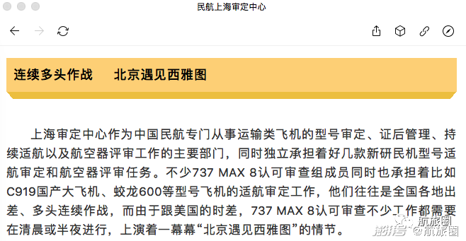 此外,C919在中国的适航审定工作同样由民航上海审定中心负责,据此前相关报道,当年担任737MAX飞机认可审查组的不少成员,也承担着C919、AG600等型号飞机的适航审定工作,他们往往是全国各地出差、多头连续作战。