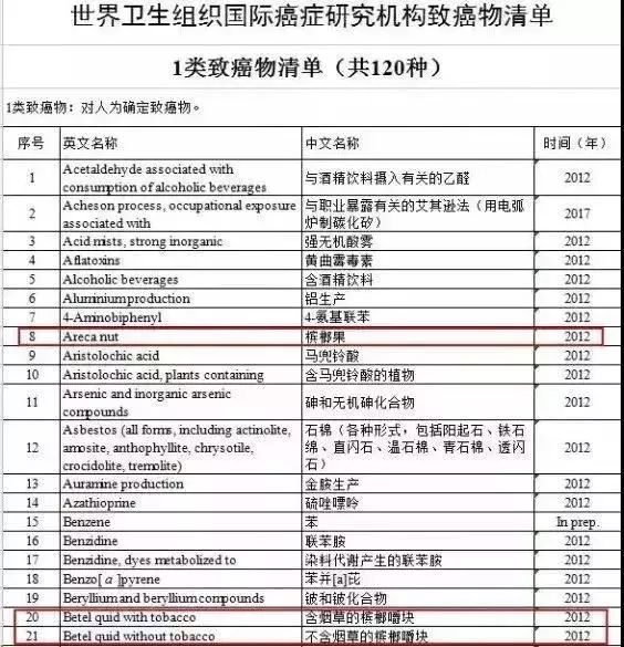 世界卫生组织致癌物清单首先,咀嚼槟榔时,槟榔纤维的摩擦会造成口腔粘膜的局部外伤和粘膜损伤。长期下去会引发慢性炎症、氧化作用增强和细胞增殖。