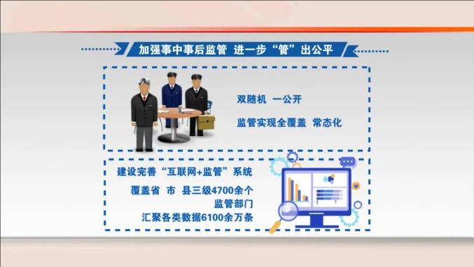 加强事中事后监管,进一步"管"出公平。"双随机、一公开"监管实现全覆盖、常态化。建设完善"互联网+监管"系统,覆盖省、市、县三级4700余个监管部门,汇聚各类数据6100余万条。