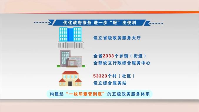 优化政府服务,进一步"服"出便利。设立省级政务服务大厅,全省2333个乡镇(街道)全部设立行政综合服务中心,53323个村(社区)设立综合服务站,构建起"一枚印章管到底"的五级政务服务体系。