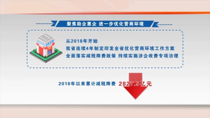 聚焦助企惠企,进一步优化营商环境。从2018年开始,我省连续4年制定印发全省优化营商环境工作方案,全面落实减税降费政策,持续实施涉企收费专项治理。2018年以来累计减税降费2827.5亿元。