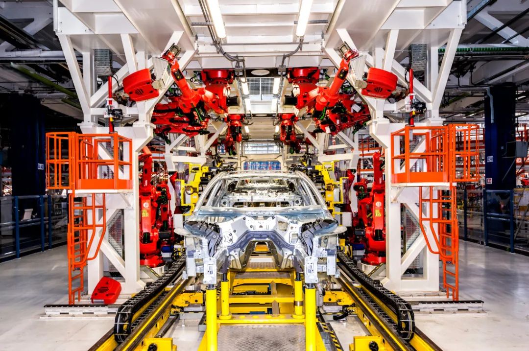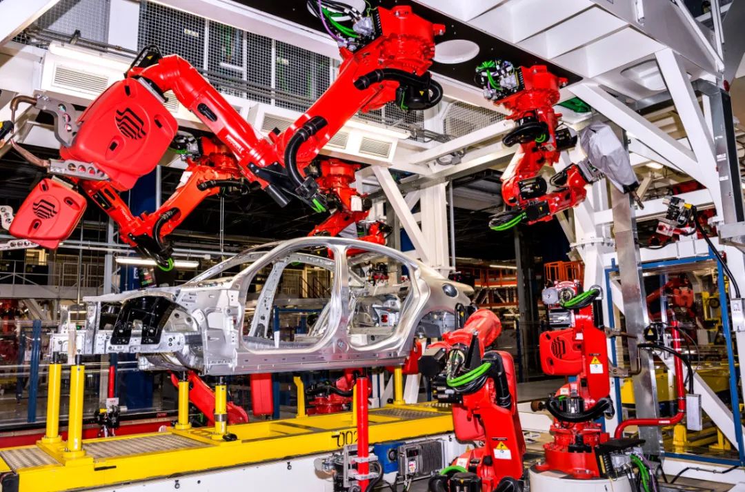 白车身产线包括两个由多个倒挂安装机器人组成的柯马OpenGate总拼工位。这些机器人首先有序地焊接底盘的结构件和侧围,再是其外侧。由于机器人可以无障碍地进入车辆的结构外骨骼,所以焊接十分高效而精准。