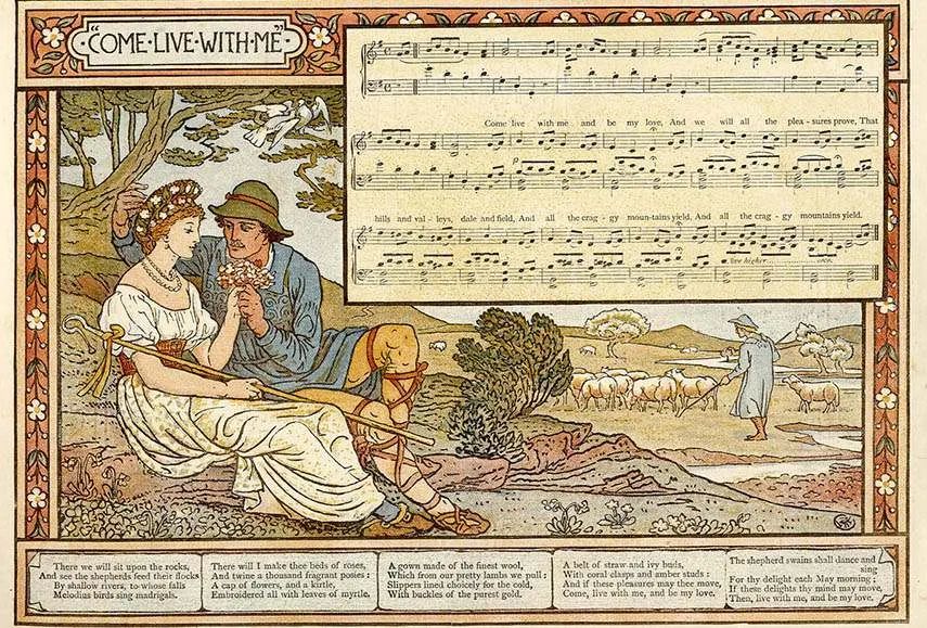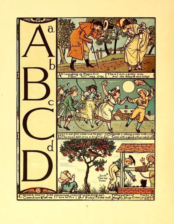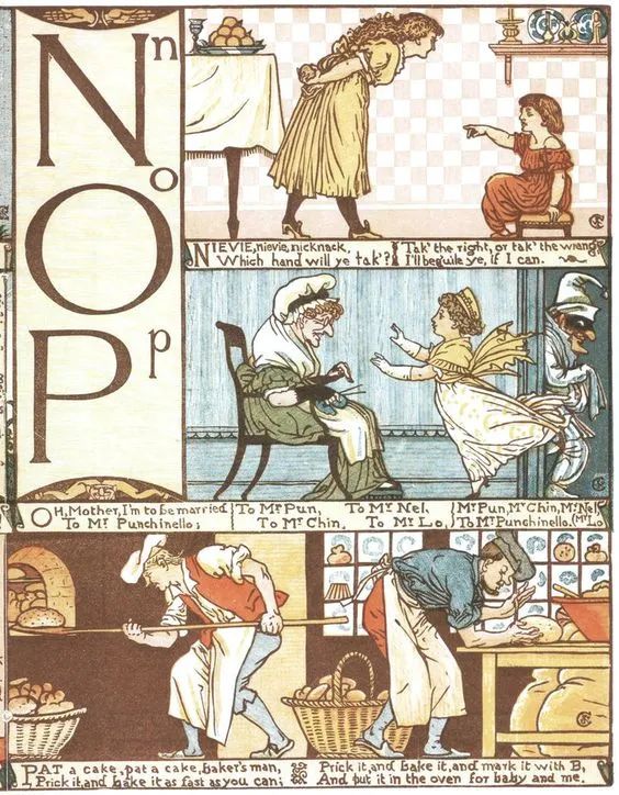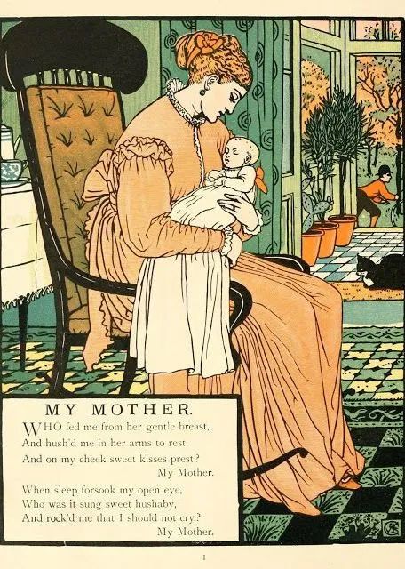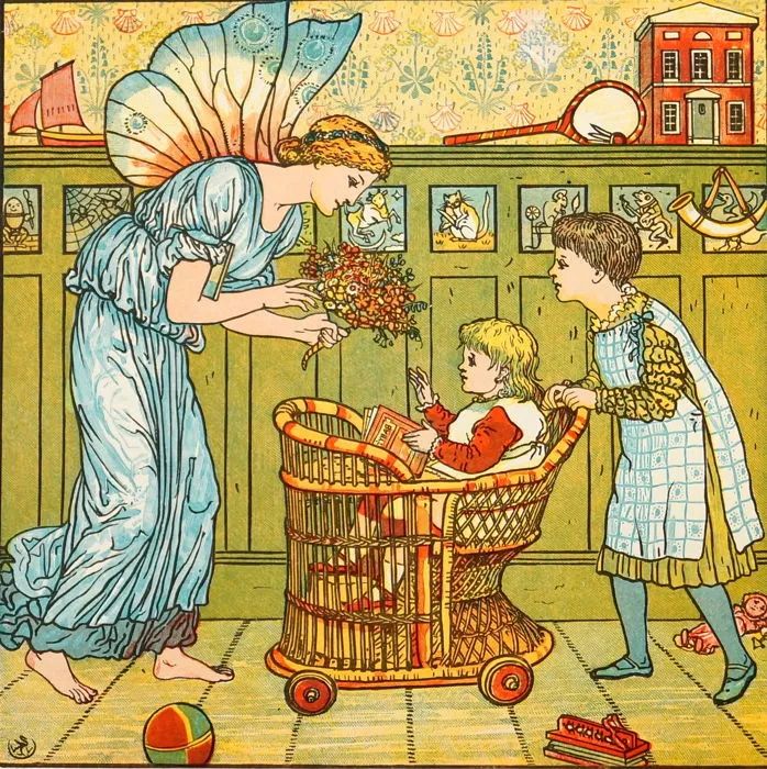 ▲ 当时的玩具书除了童话主题外,还有字母歌和韵律诗之类的题材。他用前拉斐尔派的风格来创作儿童画,精心设计人物造型,飘拂的长袍、慵懒的姿态……