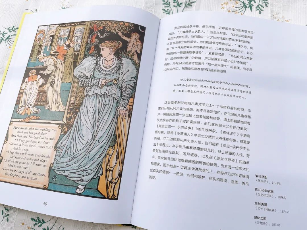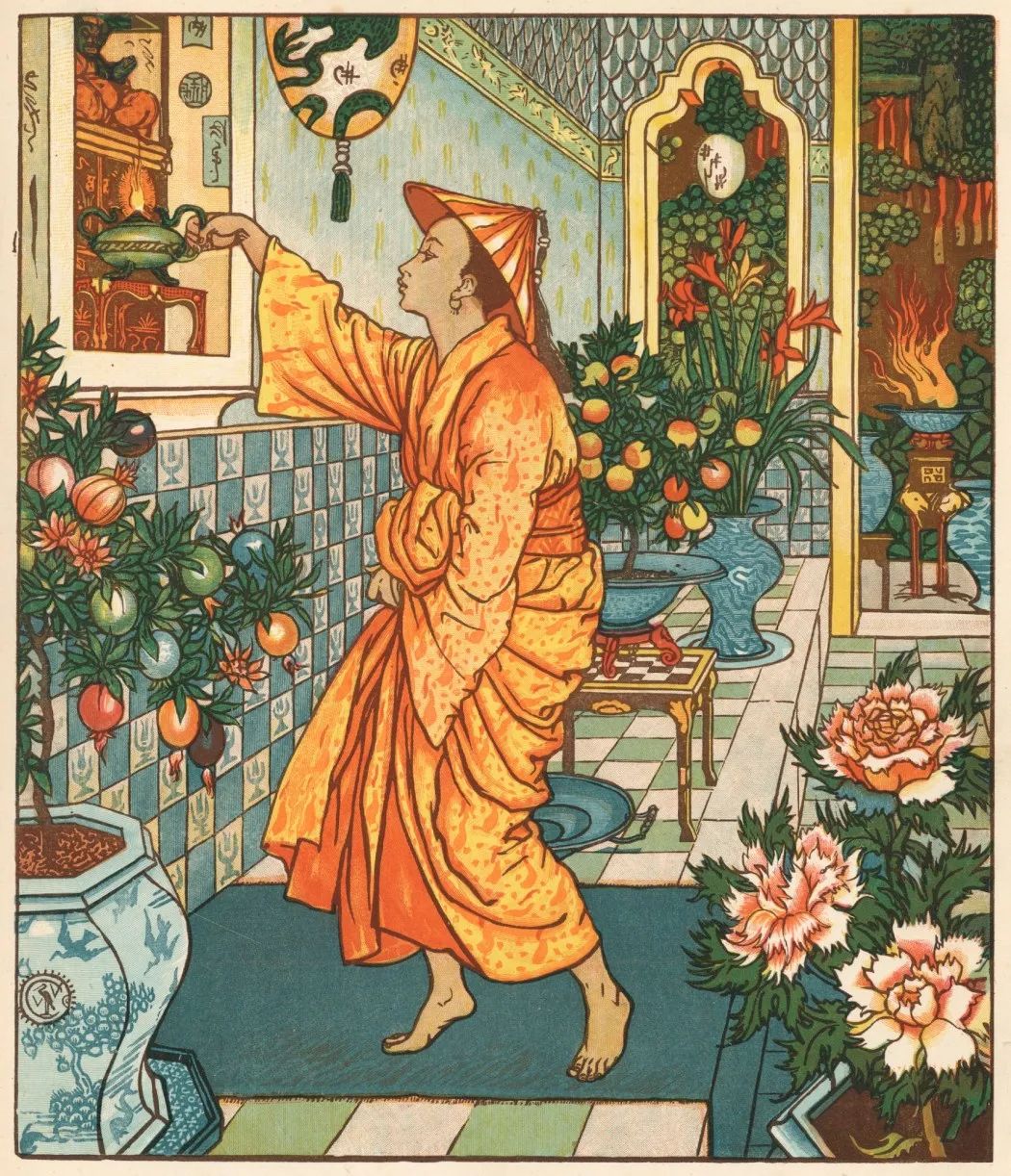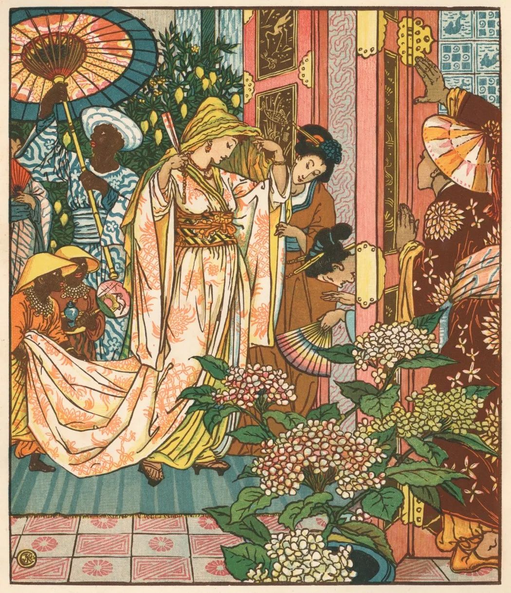 过去都是将画家的画雕成木版,再印刷成书,而克兰的画风太过细致,印刷容易丢失细节,于是他很快随机应变,改用更简洁的线条风格。他从日本浮世绘中获取灵感,清晰的黑色轮廓,平整的明亮颜色,充满戏剧性和装饰性。