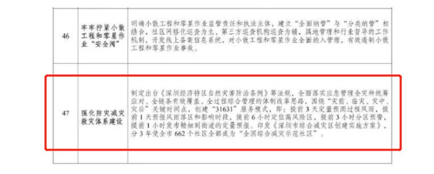 近日,国家发改委发布《关于推广借鉴深圳经济特区创新举措和经验做法的通知》,推广党的十八大以来深圳经济特区5方面47条创新举措和经验做法。其中,在创新推动城市治理体系和治理能力现代化方面,深圳气象“创建‘31631’服务模式”作为“强化防灾减灾救灾体系建设”的经验被纳入其中。