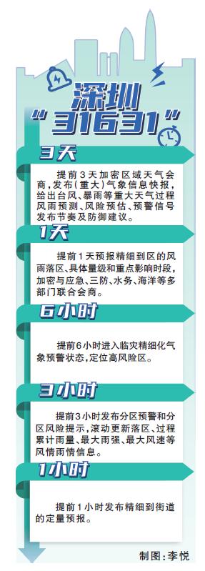 在台风、暴雨等重大天气来临前,气象部门提前3天加密区域天气会商,发布(重大)气象信息快报,给出过程风雨预测、风险预估、预警信号发布节奏及防御建议;提前1天预报精细到区的风雨落区、具体量级和重点影响时段,加密与应急管理、三防、水务、海洋等多部门联合会商;提前6小时进入临灾精细化气象预警状态,定位高风险区;提前3小时发布分区预警和分区风险提示,滚动更新落区、过程累计雨量、最大雨强、最大风速等风情雨情信息;提前1小时发布精细到街道的定量预报。“城市治理要求各项工作打出一定提前量,‘31631’是按照中国气象局《短时临近天气预报业务规定》及相关技术标准,在基层防灾减灾实践中逐渐形成,目标是让防灾部门及一线工作人员对气象的服务节奏心里有数,依据尽可能精准的预报有针对性地进行安排部署。”深圳市气象局局长王延青说。