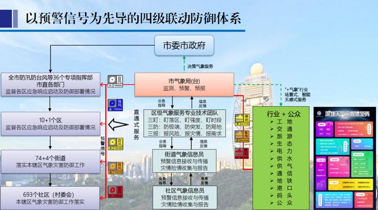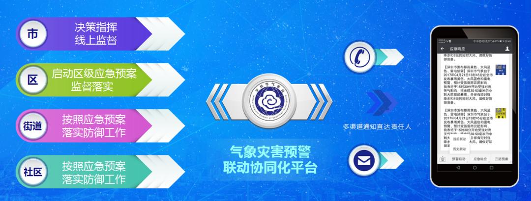 如今,深圳市气象局与市三防指挥部共享“应急一键通”平台,并通过市区三防决策微信群等渠道,实时向全市5.3万名三防成员单位,市、区、街道、社区四级和重点企事业单位的防灾责任人发布预警服务图文信息,实现智慧气象平台与市住房建设局建设工程智能监管平台、市建筑工务署指挥调度系统平台实时对接。市气象局靶向预警信息发布和自动叫应机制也更加完善,目前已实现基于大数据分析技术对预警信息“百米级区域”靶向精准发布和“特定人群”按需对点发布,预警信息秒级千条发送,任意街道办或风险区域分钟级发布,以及全用户发布、全媒体触达,并打造了纵向到底、横向到边,多部门预警信息共享共用权威发布平台。