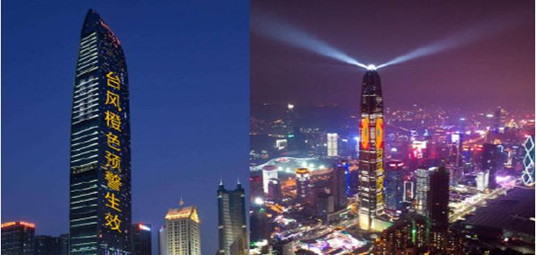 “山竹”影响期间,首次通过平安大厦、京基100 等高层楼宇外墙显示预警信息。2018年9月,超强台风“山竹”袭击深圳。9月14日12时30分,盐田国际集装箱码头有限公司收到市气象台发布的台风白色预警,考虑到该台风强度超强,便决定停止闸口交收服务,并提前告诉拖车司机,避免盐田区交通堵塞,港口空箱全部绑扎。