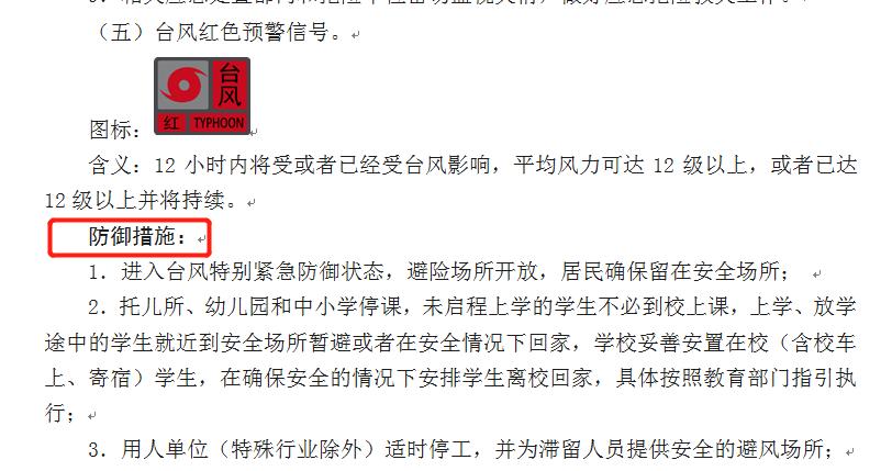 以市政府规章《深圳市气象灾害预警信号发布规定》为例,该规定明确了不同预警下的主要防御措施。如在台风红色等高级别预警信号下全市采取“四停”措施,规定广播、电视、新媒体和有关通信运营企业需在15分钟内传播信息。发布暴雨红色预警时,托儿所、幼儿园和中小学停课;除必须在岗的工作人员外,用人单位根据工作地点、工作性质、防灾避灾需要等情况安排工作人员推迟上班、提前下班或者停工。